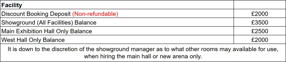 Showground Booking – This secures use of all the public areas of the showground, free car parking, WC’s and WIFI. Catering can be provided or arranged separately.